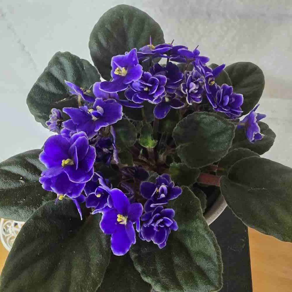 ’Saintpaulia ’Ness’ Crinkle Blue’ on kaunis puolikerrottu – kerrottu lajike, jossa on herkän kauniit kukat, siniliilat jossa valkoiset reunat.